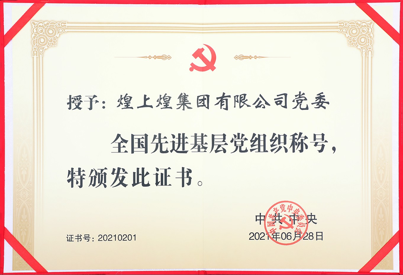 2021年,煌上煌集團(tuán)黨委被中共中央授予“全國先進(jìn)基層黨組織”榮譽(yù)稱號。