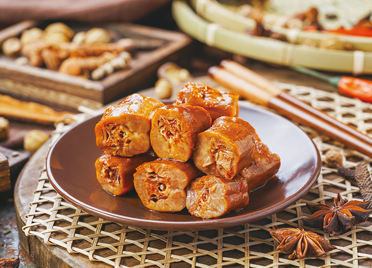 產(chǎn)品介紹:精選規(guī)格一致的新鮮鴨脖,摘凈淋巴組織,采用多種調(diào)味料腌漬,經(jīng)真空滾揉后風(fēng)味物質(zhì)滲透至椎骨之中。采用20多種中藥、香料濃湯鹵汁。產(chǎn)品外呈醬紅,脖肉成束脆嫩,脖骨包含湯汁細(xì)啃味長。近年來,鹵鴨脖悄然成為休閑熱點(diǎn)醬禽鹵肉制品。
